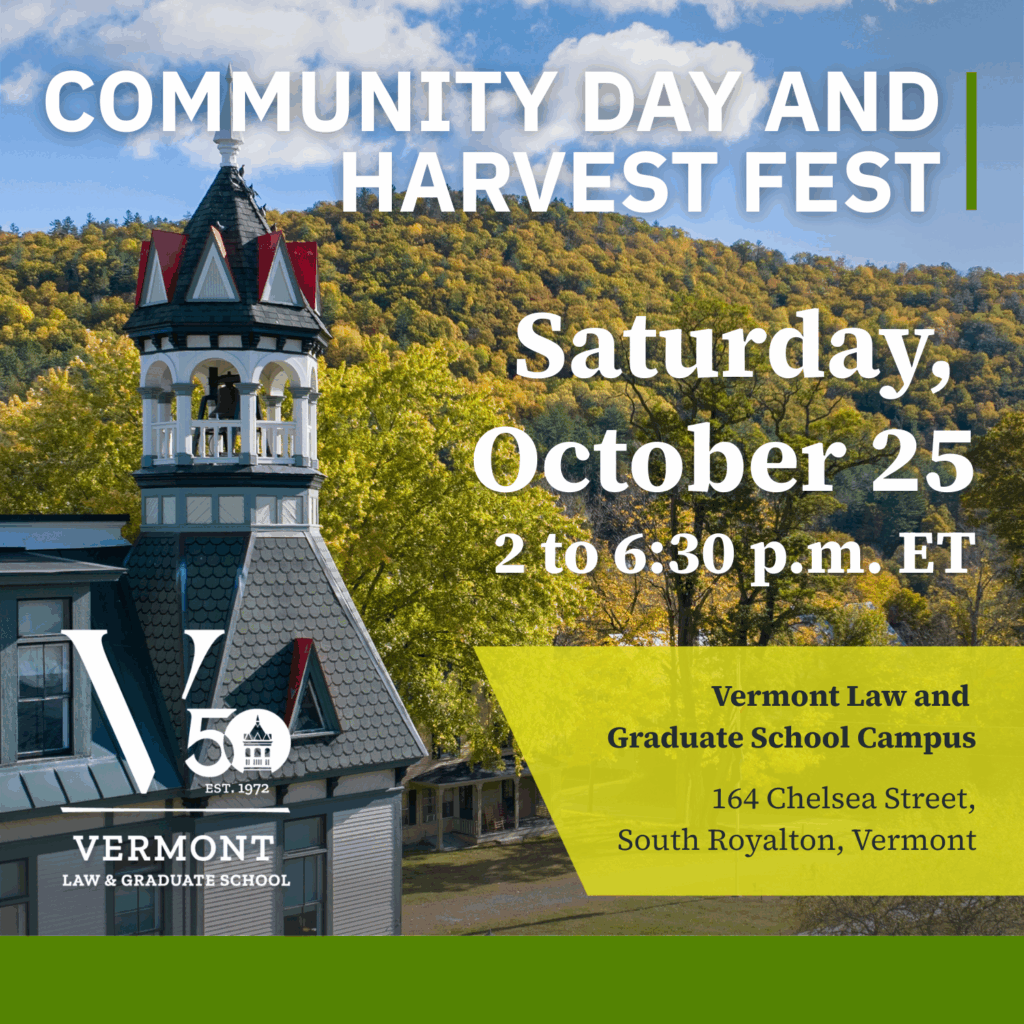 Celebrate community with an afternoon of music, activities, campus tours, thoughtful conversation, and a shared meal. We’re excited to bring together neighbors, families, local businesses, and the Vermont Law and Graduate School community for this special day.