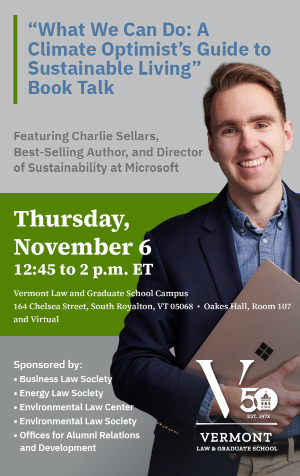 Join us for an engaging book talk with Charlie Sellars, director of sustainability at Microsoft and author of the #1 best-selling climate book, “What We Can Do: A Climate Optimist’s Guide to Sustainable Living.”
